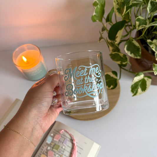 Meet me at the Bookshop Bookish Glass Mug – Aesthetic Clear Mug for Coffee & Book Lovers