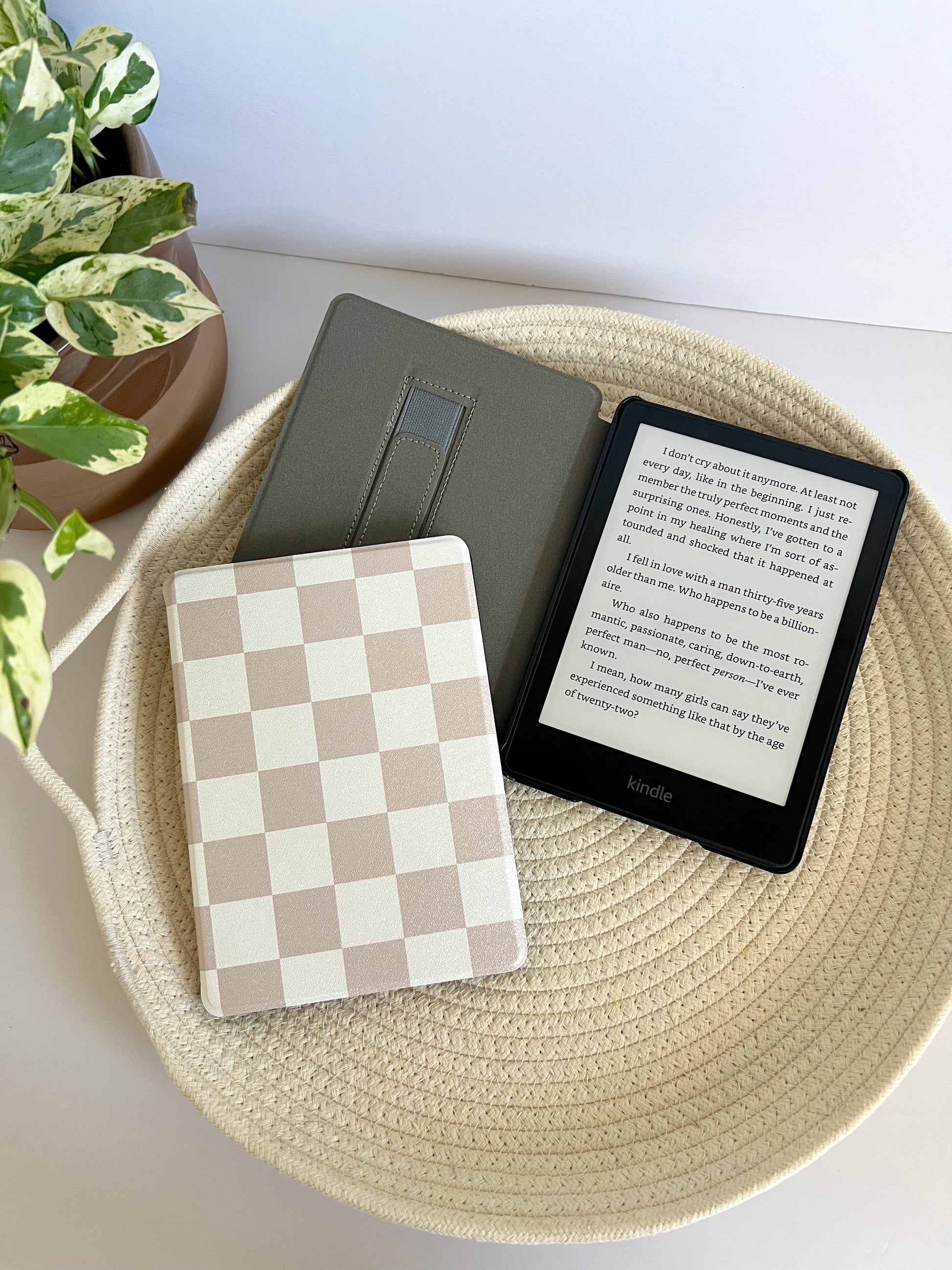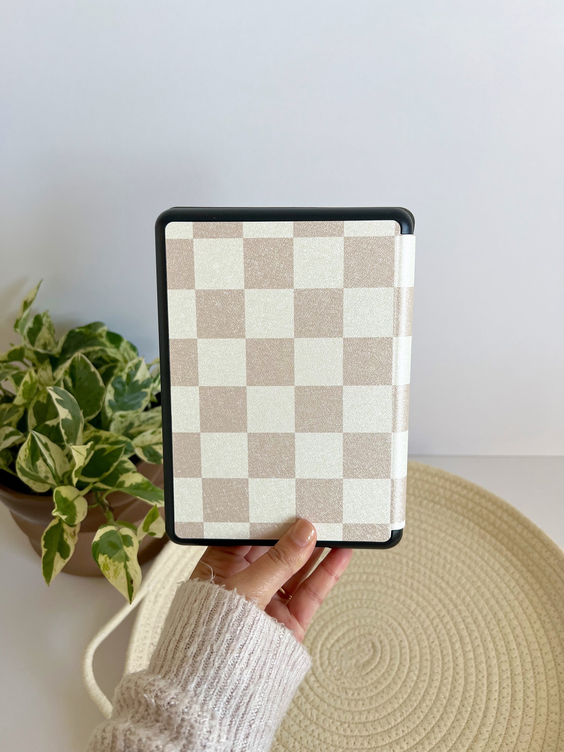 Protect your e-reader with this stylish Beige Checkered Kindle Case. The magnetic closure keeps your device safe, while the hand strap allows for easy carrying. Available in Kindle Paperwhite 6.8in 11th Gen and 12th Gen, it's the perfect blend of fashion and function.