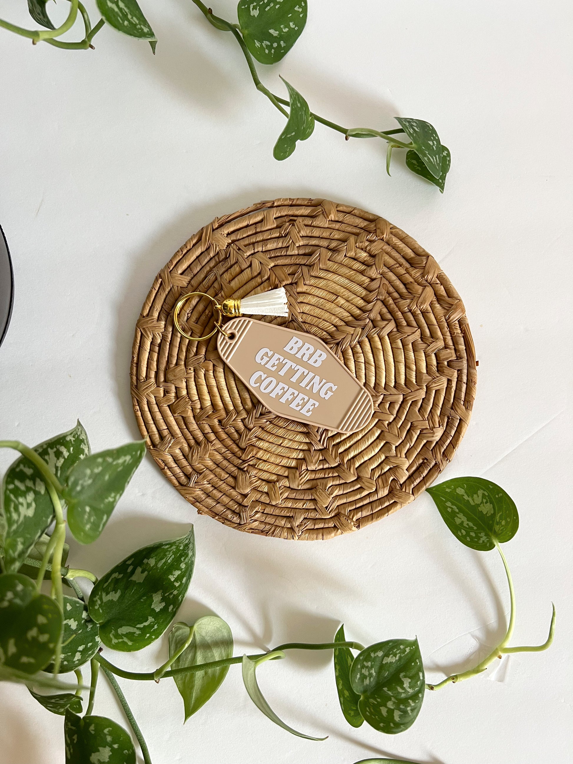 This retro-style motel keychain features the phrase "BRB Getting Coffee," a playful reminder of the classic 'coffee run' for busy office workers and students. It's a simple, stylish accessory that adds a touch of fun to any set of keys.