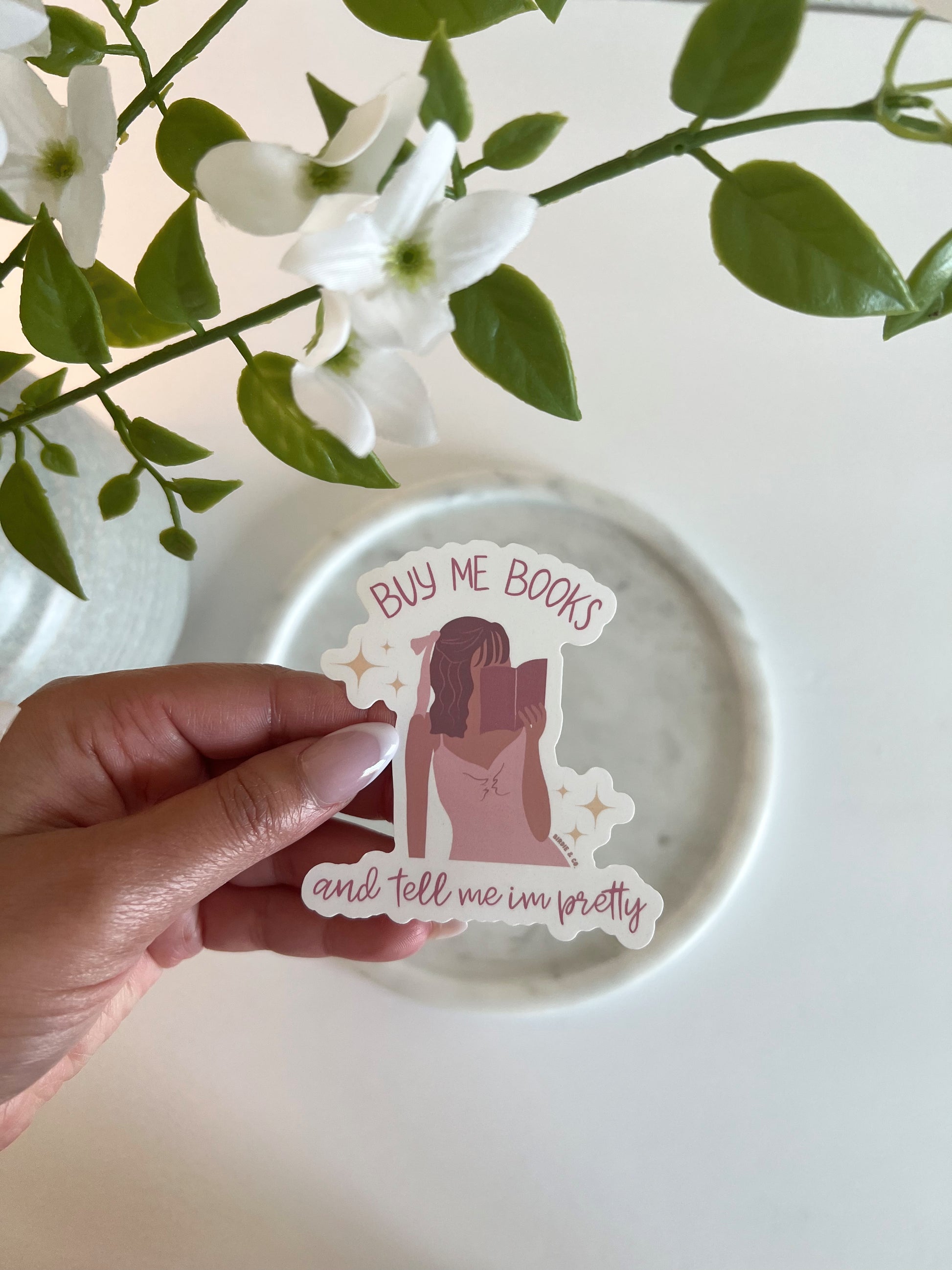 Get this sticker for the book lover in your life! It's perfect for showing off their love for reading and will definitely put a smile on their face. With the witty phrase "Buy me books and tell me I'm pretty," this sticker is sure to be a hit.