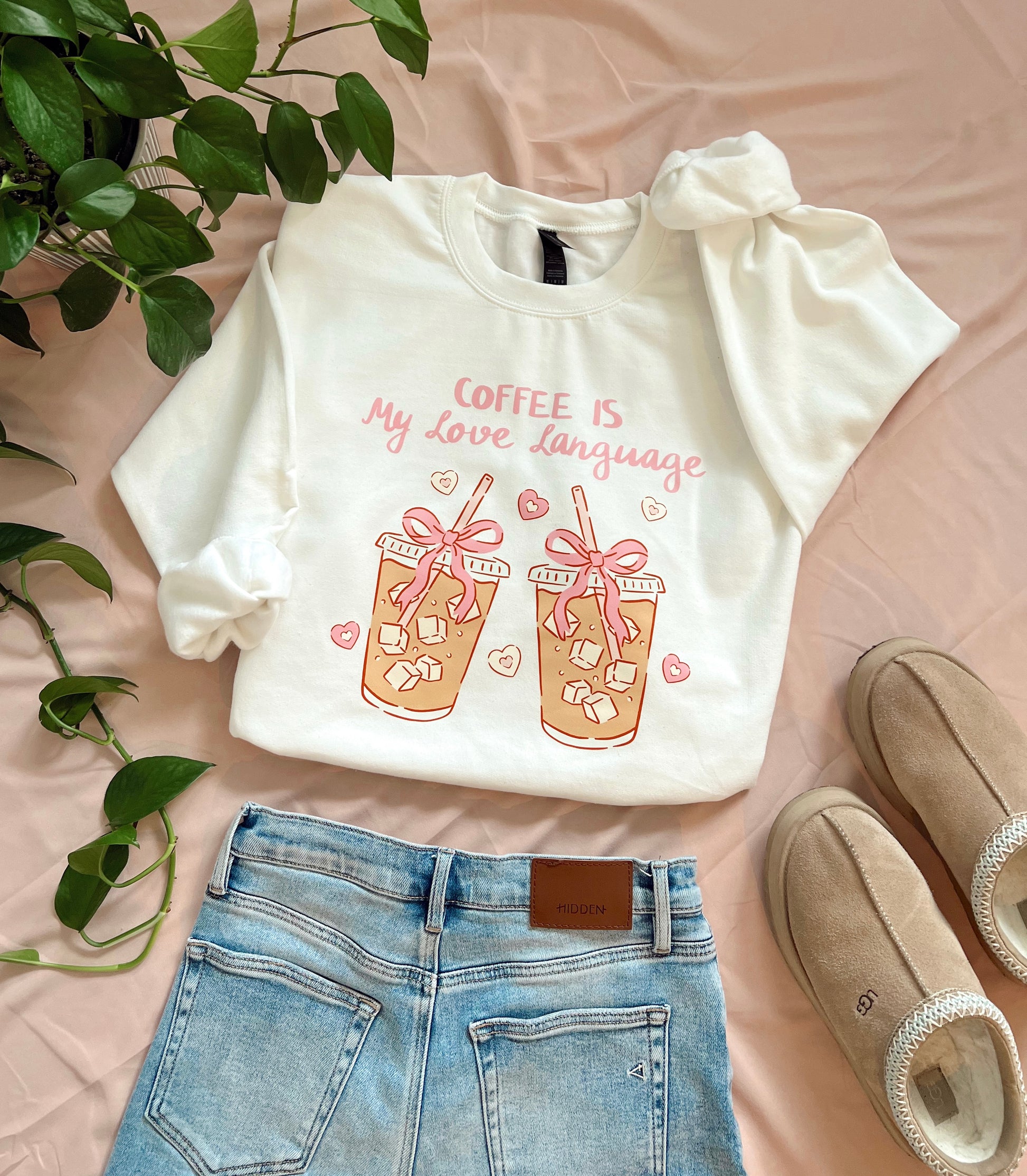 Get cozy with our "Coffee is my Love Language" crewneck sweater. Made with a soft white fabric, this sweater features a girly pink bow and iced coffee design. Perfect for any coffee lover, stay warm and stylish in this quirky sweater. Caffeine not included! ;)