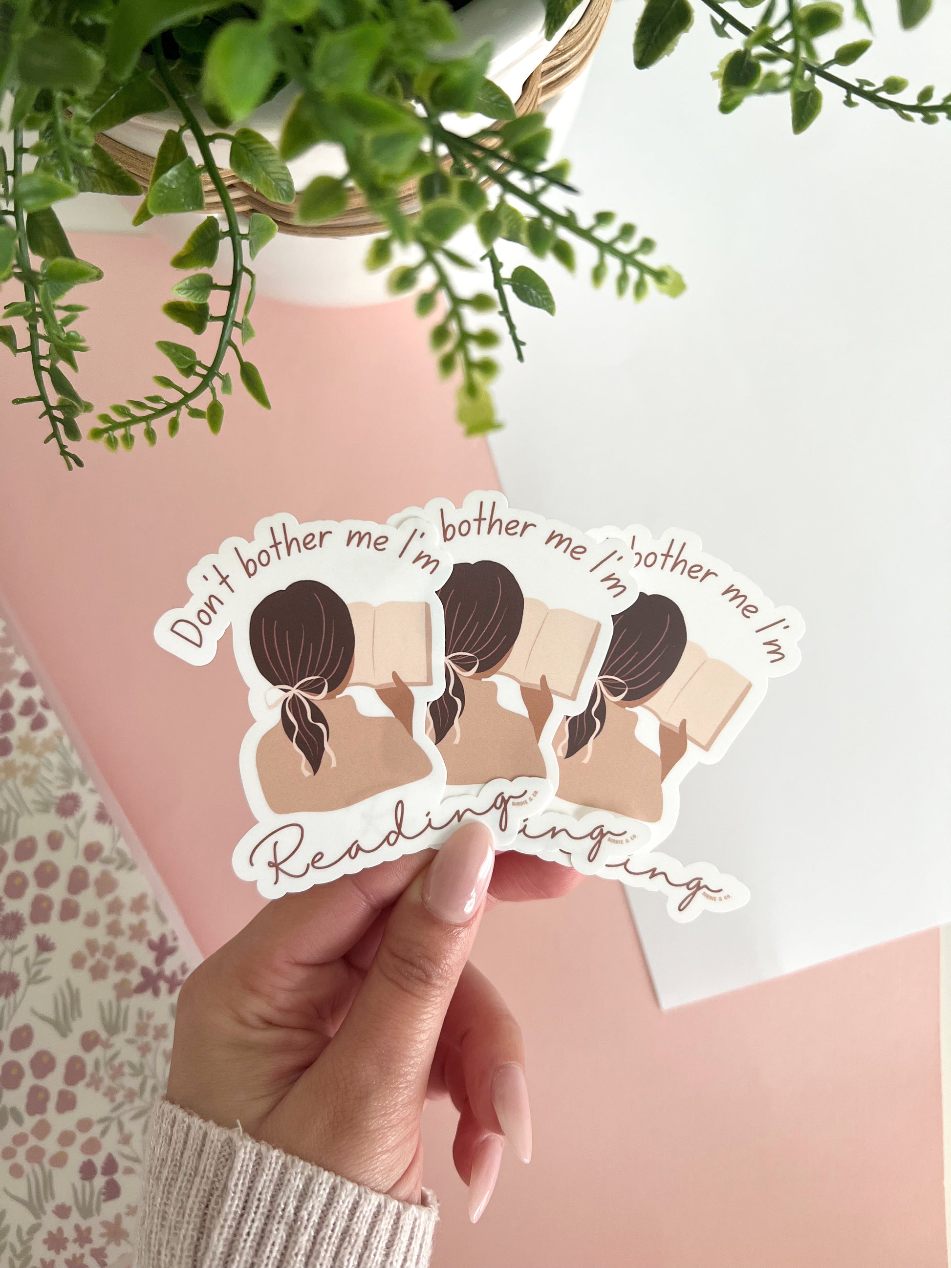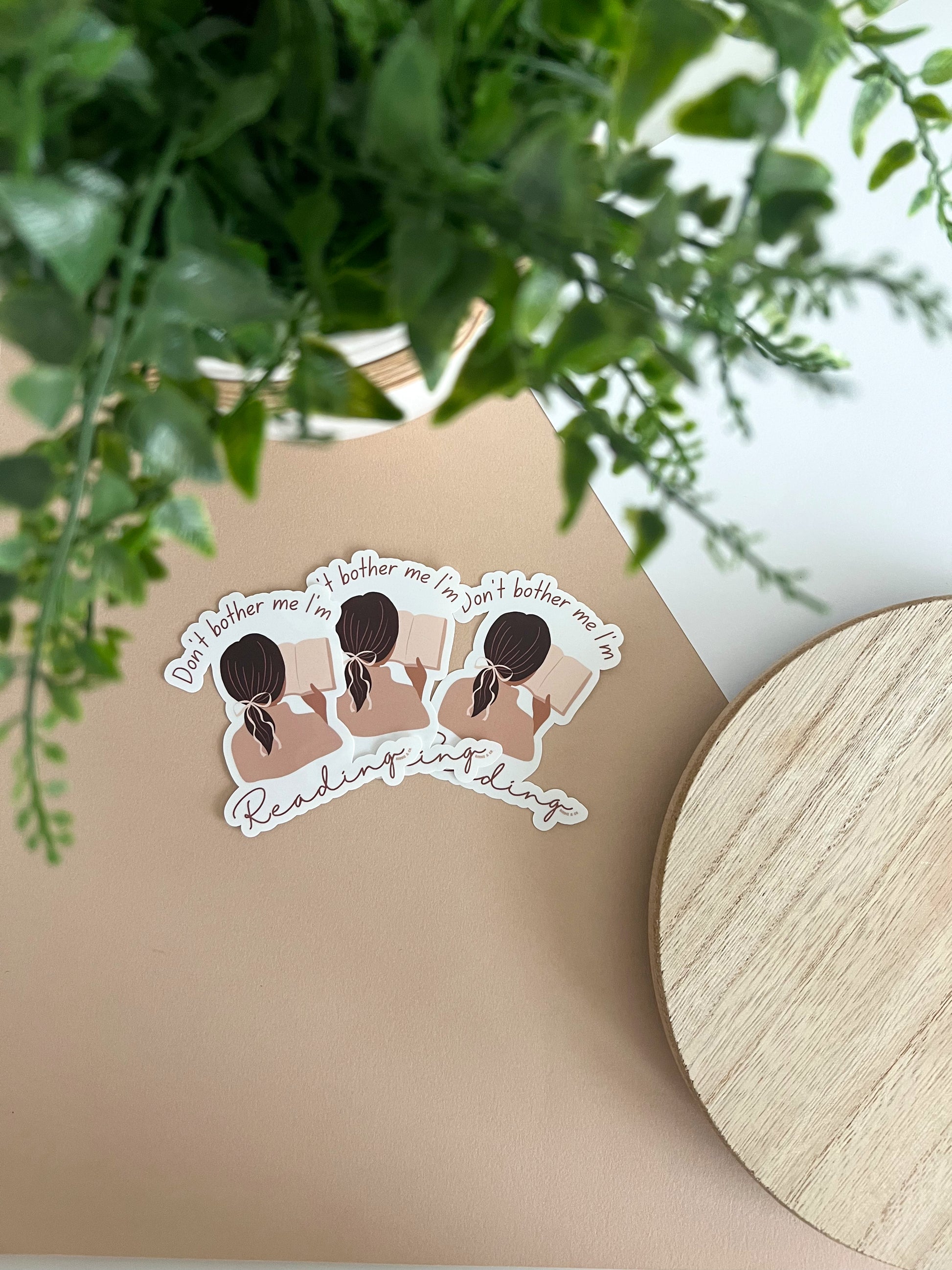 Add personality and character to your water bottle, laptop, kindle etc. with our waterproof “Don’t bother me I’m reading” sticker. It’s the perfect sticker for any book lover!