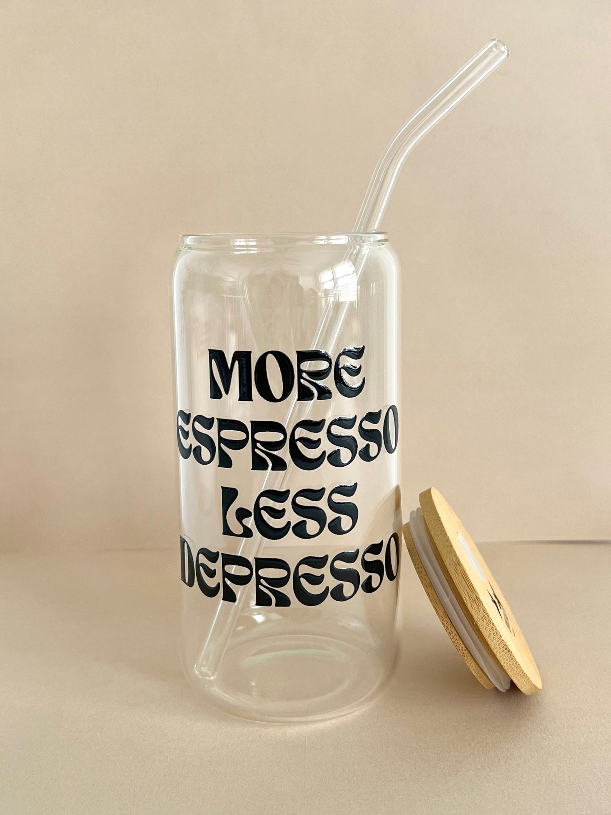 Introducing the More Espresso Less Depresso Can Glass, perfect for any coffee enthusiast. Featuring an ergonomic design and crafted with heat-resistant glass, this can glass holds up to 16oz of your favorite beverage and is designed to perfectly fit the size of your favorite canned drinks. Enjoy your favorite drink with the More Espresso Less Depresso Can Glass!