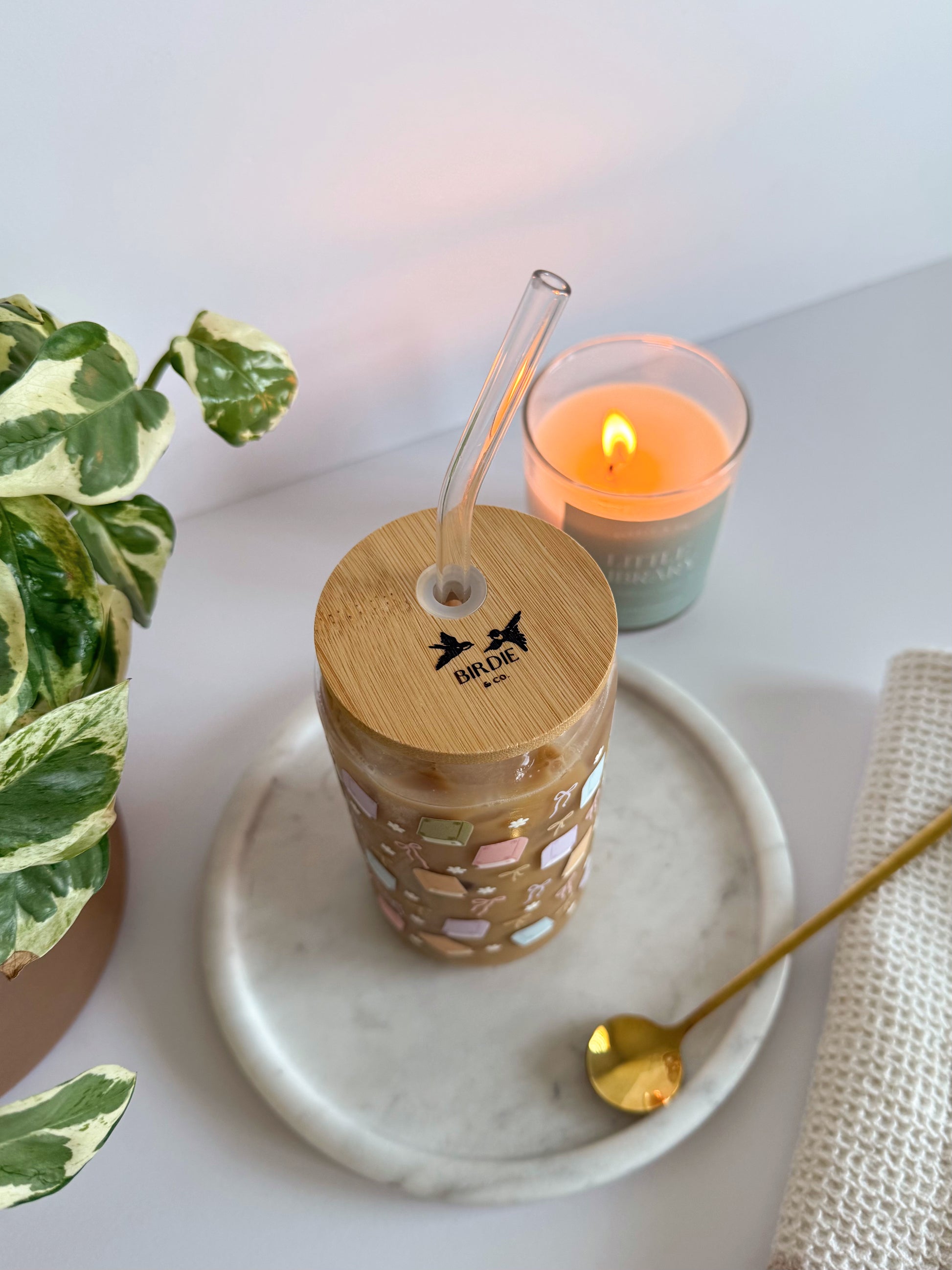 Bring bookish charm to your daily coffee ritual with our Pastel Books Iced Coffee Glass. This reusable glass can cup is decorated with pastel-colored books and dainty bow accents, making it the perfect accessory for readers, students, and teachers who love coffee (or tea!) as much as they love books.