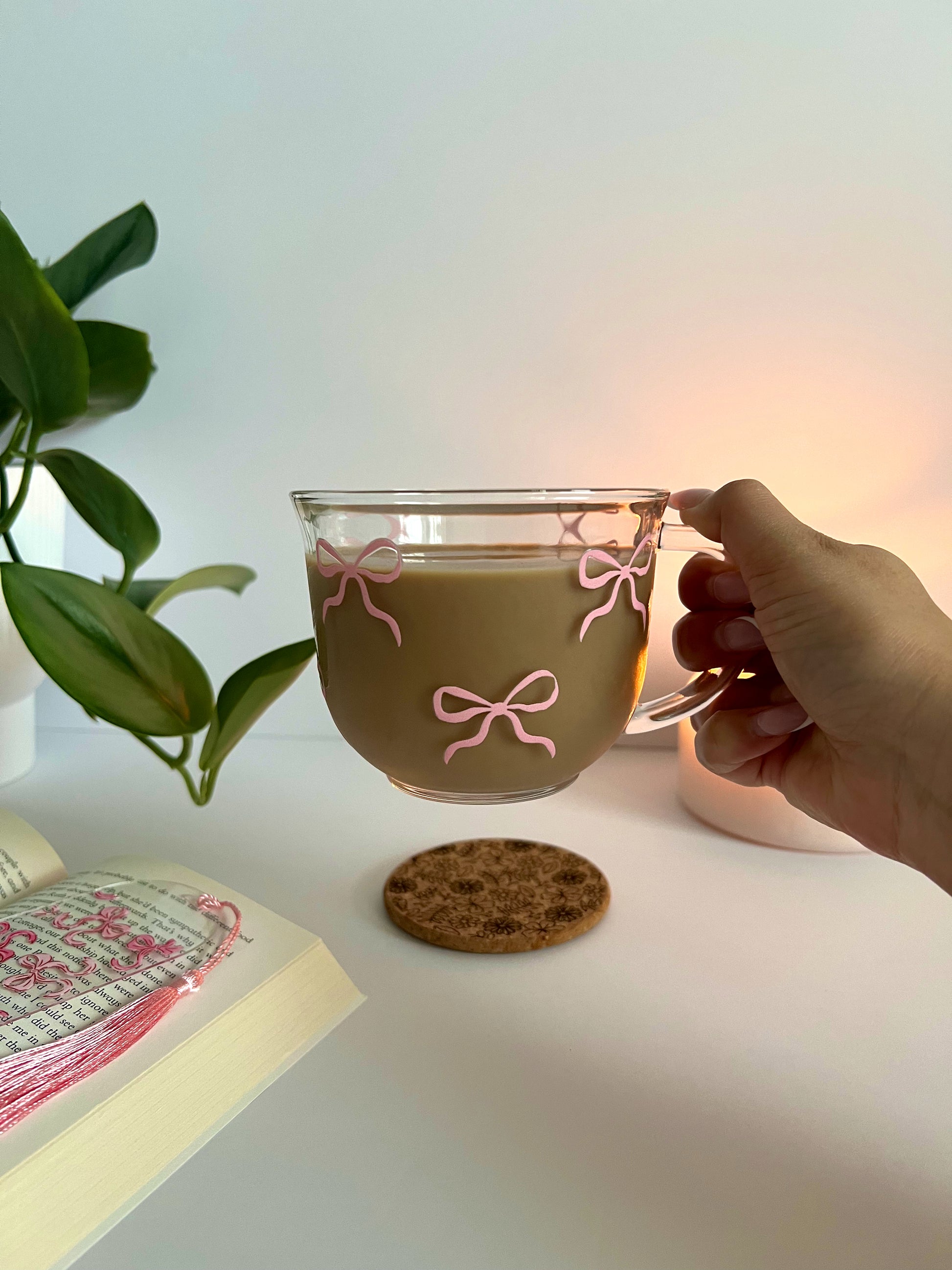 Enjoy your coffee in our pink bow glass coffee mug! Featuring a minimalist pink bow design, this mug has an aesthetic that is both elegant and playful.