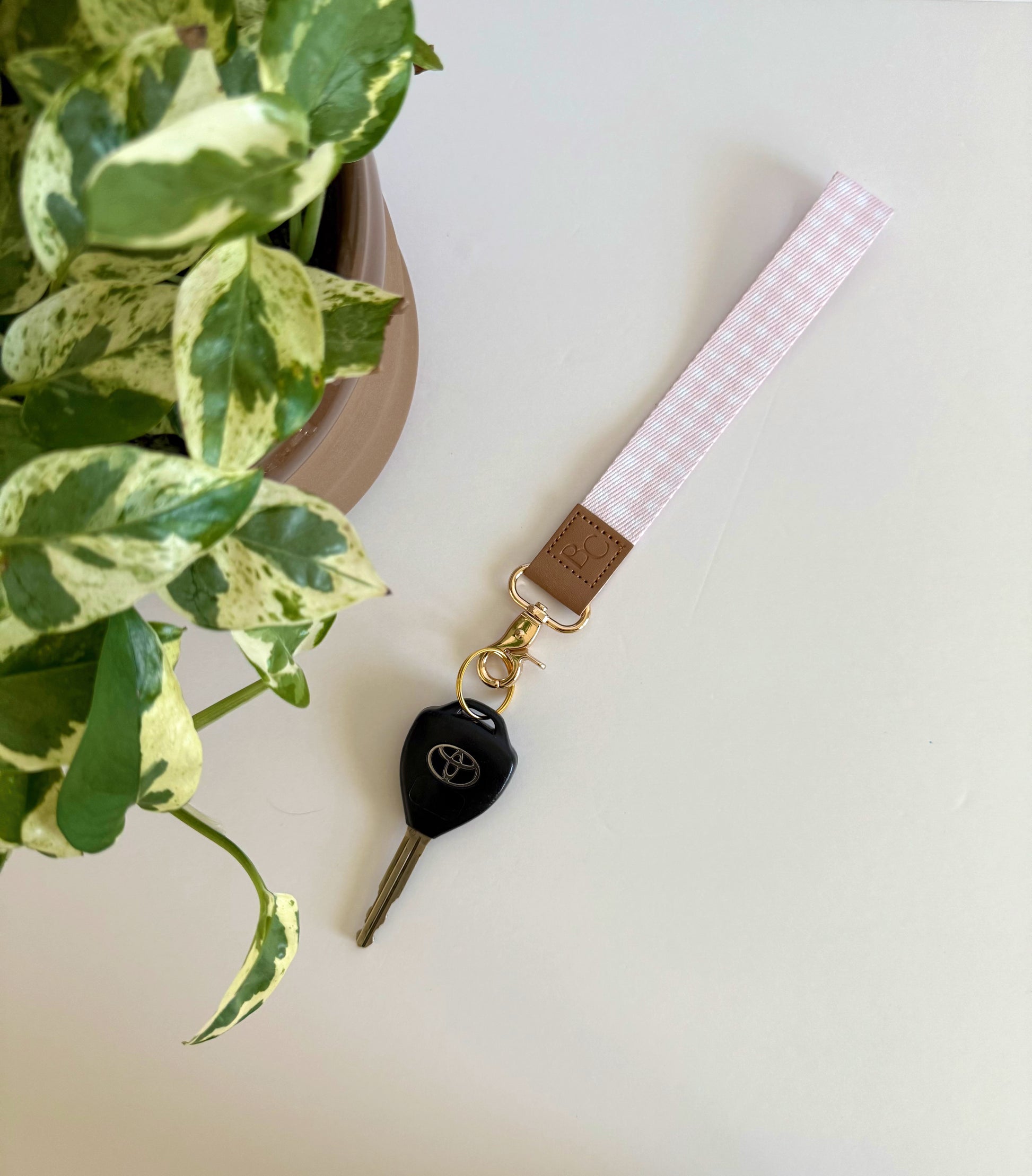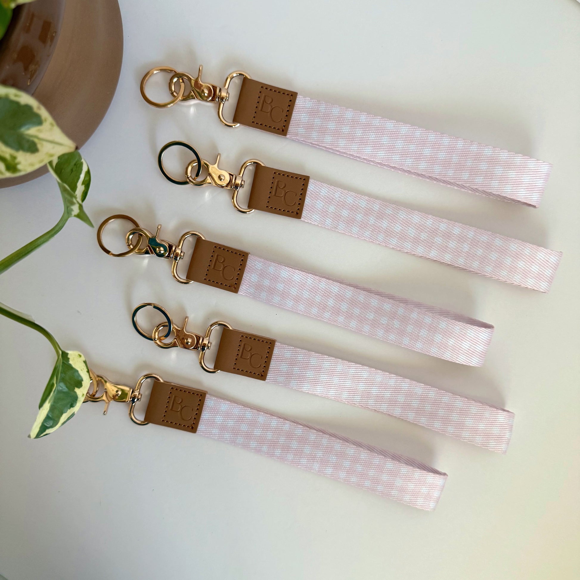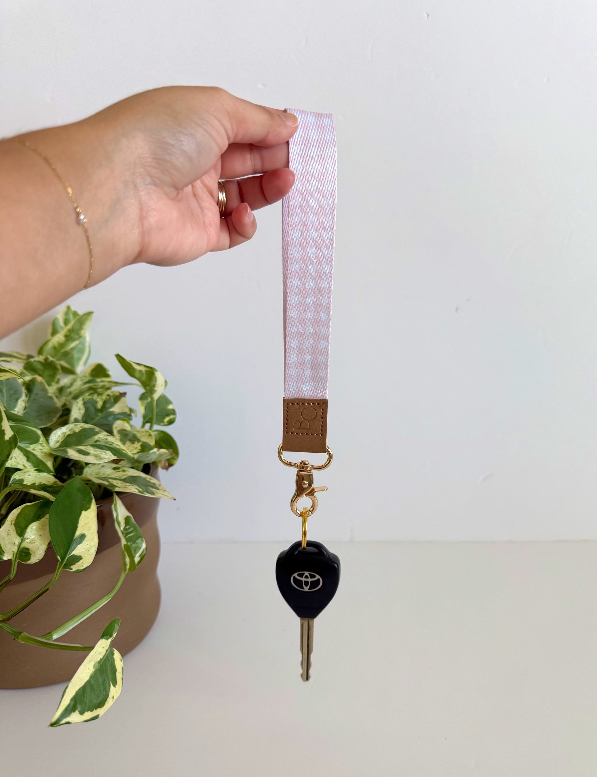 Our Pink Gingham Wristlet Keychain offers a blend of style and functionality. Crafted with leather detailing, featuring our embossed logo and finished with elegant gold hardware, this keychain is designed for everyday use. Its wristlet design provides convenient, hands-free carrying, perfect for staying organized and accessible while on the go.