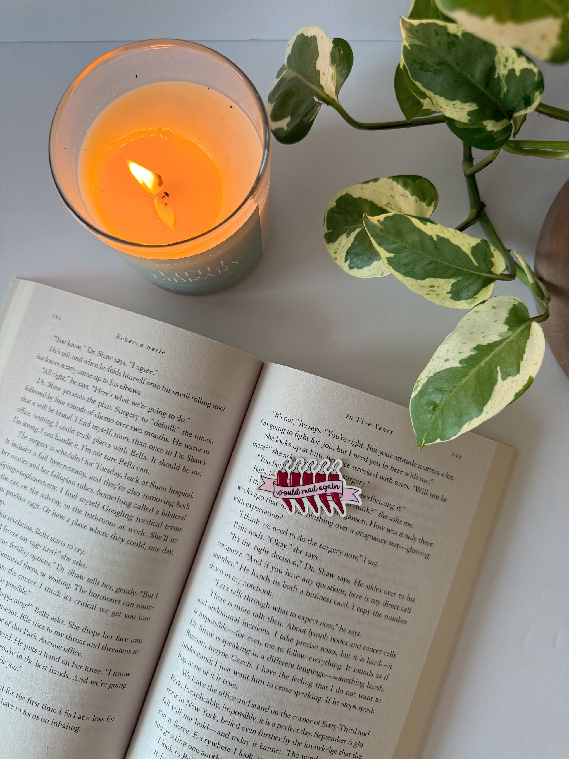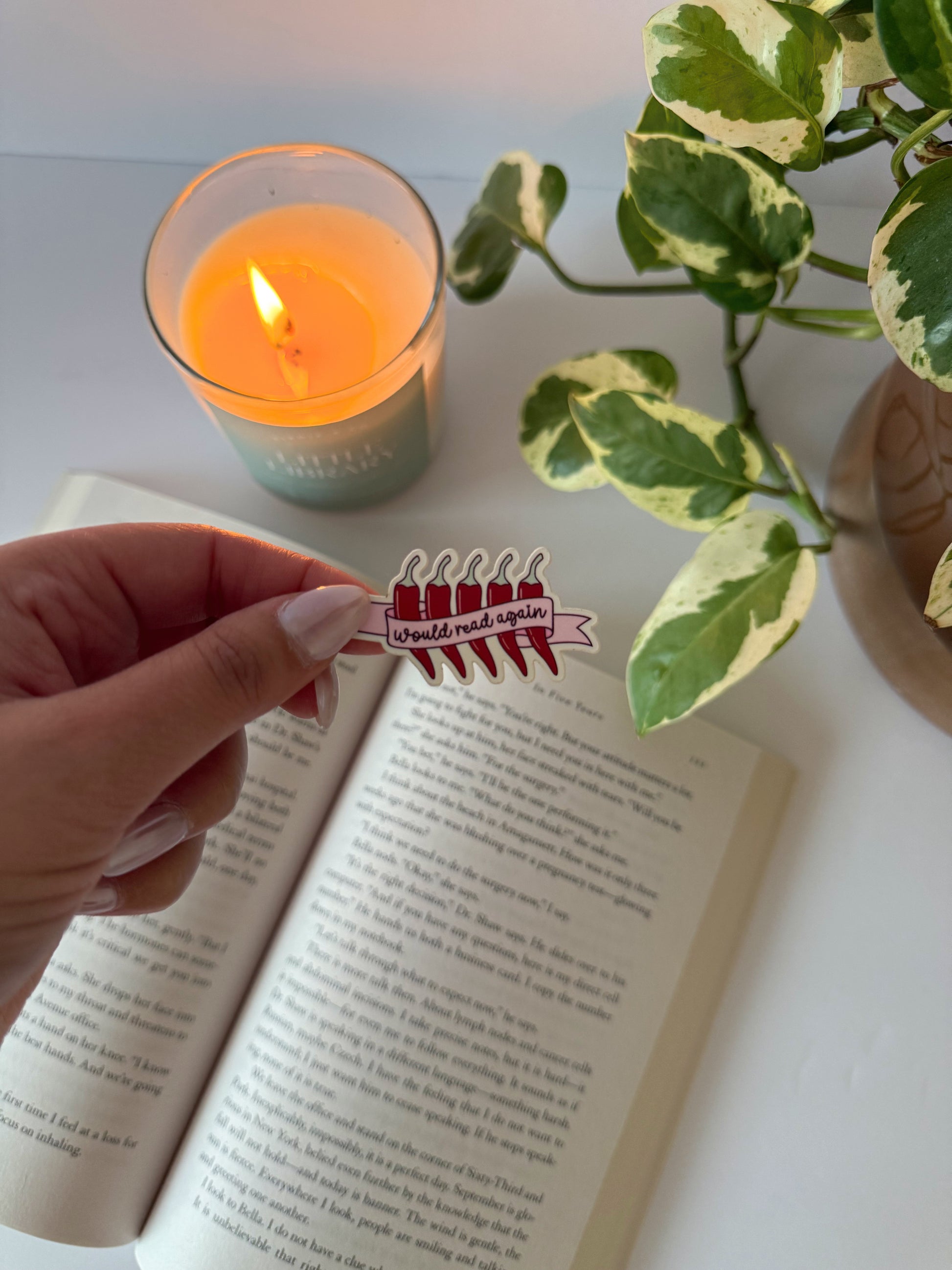 For books that live rent-free in your head. Our Would Read Again chili pepper sticker is a must-have for readers who love spicy romance, unforgettable plots, and five-star reads. Featuring a playful chili pepper design, this bookish sticker is perfect for decorating Kindles, laptops, planners, journals, etc.