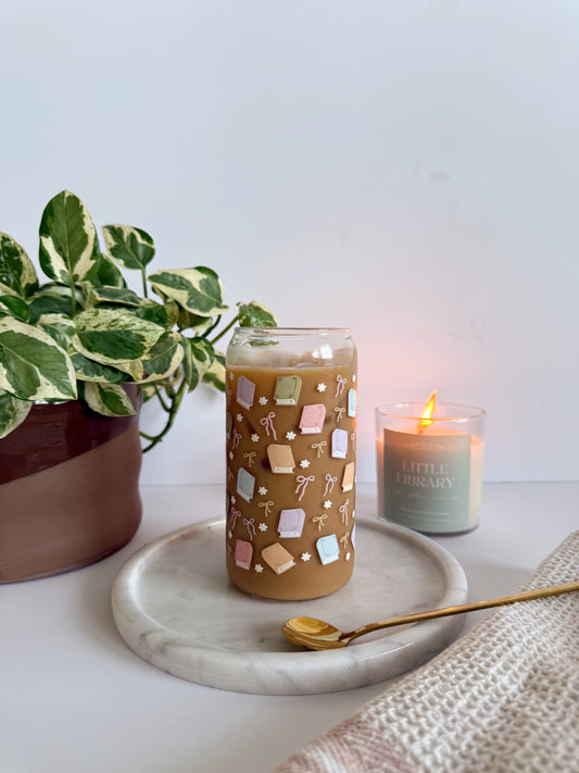 Pastel Books Iced Coffee Glass – Reusable Glass Can Cup with Book Lover Design